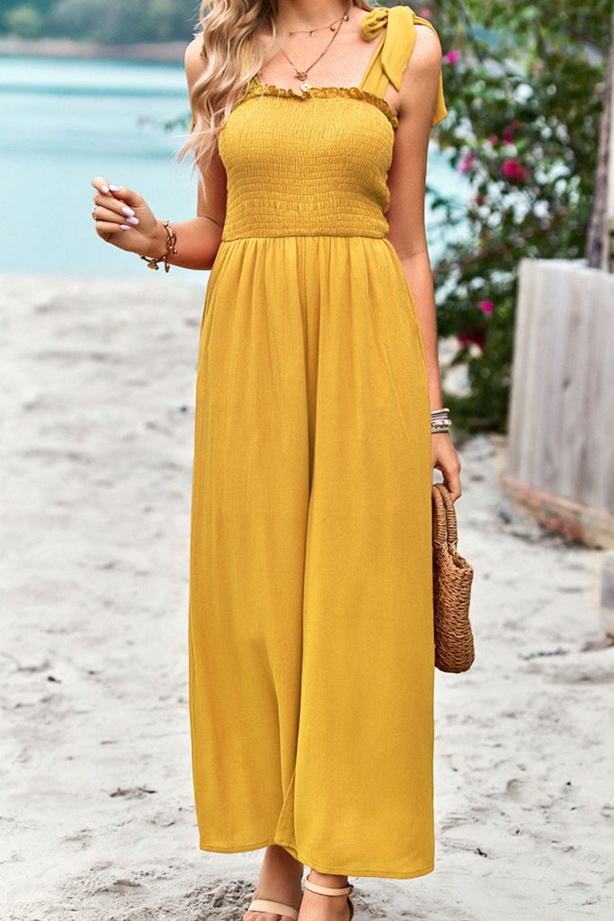Frill Trim Tie Shoulder Wide Leg Jumpsuit with Pockets