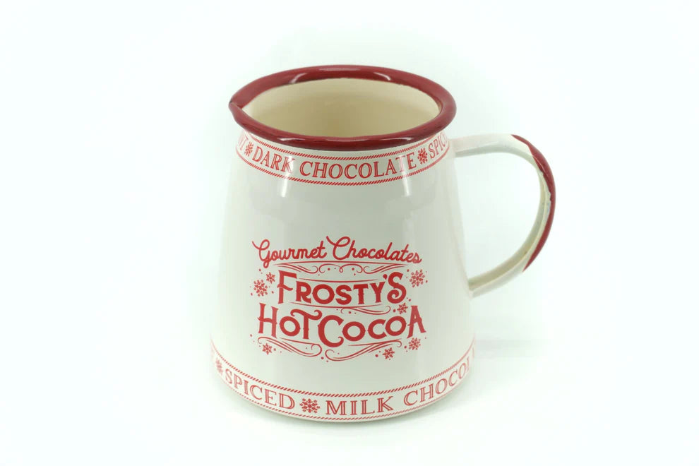 Frosty's Hot Cocoa Enamel Mug has a white finish with a bright red rim and a handle for carrying or for hanging to display. Full of detail, the mug's center features red illustrations and text reading "Gourmet Chocolates - Frosty's Hot Cocoa". Around the top and bottom edges of the mug is "Peppermint - Dark Chocolate - Spiced - Milk Chocolate" in red lettering with festive red snowflake accents. Measures 5" x 5" x 5".Â