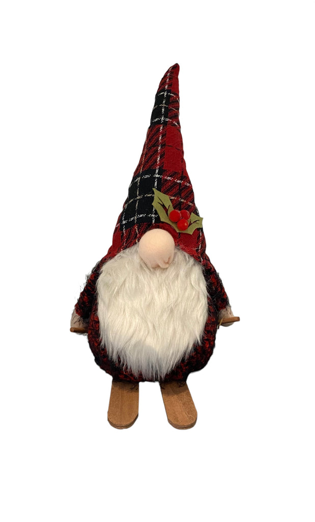 Donning a vibrant red check hat and a cozy red and black shirt, this festive gnome comes equipped with skis, poles, and a classic fluffy white beard.